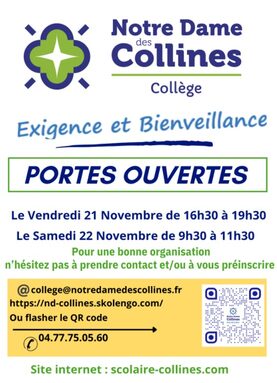 Les journées portes ouvertes du collège auront lieu le vendredi 21 novembre 2025, de 16h30 à 19h30 et le samedi 22 novembre 2025, de 9h30 à 11h30.